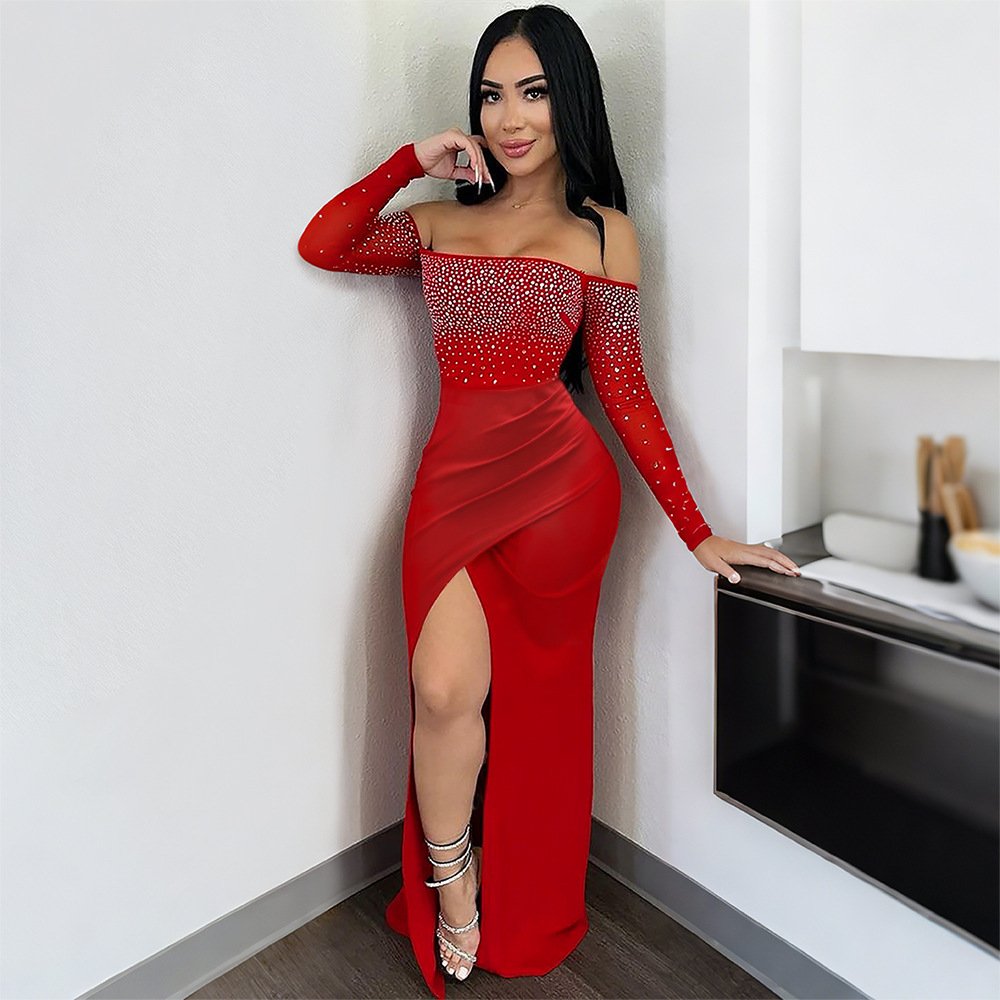 Off-shoulder Handmade Diamond Strip Dress Evening Dress
